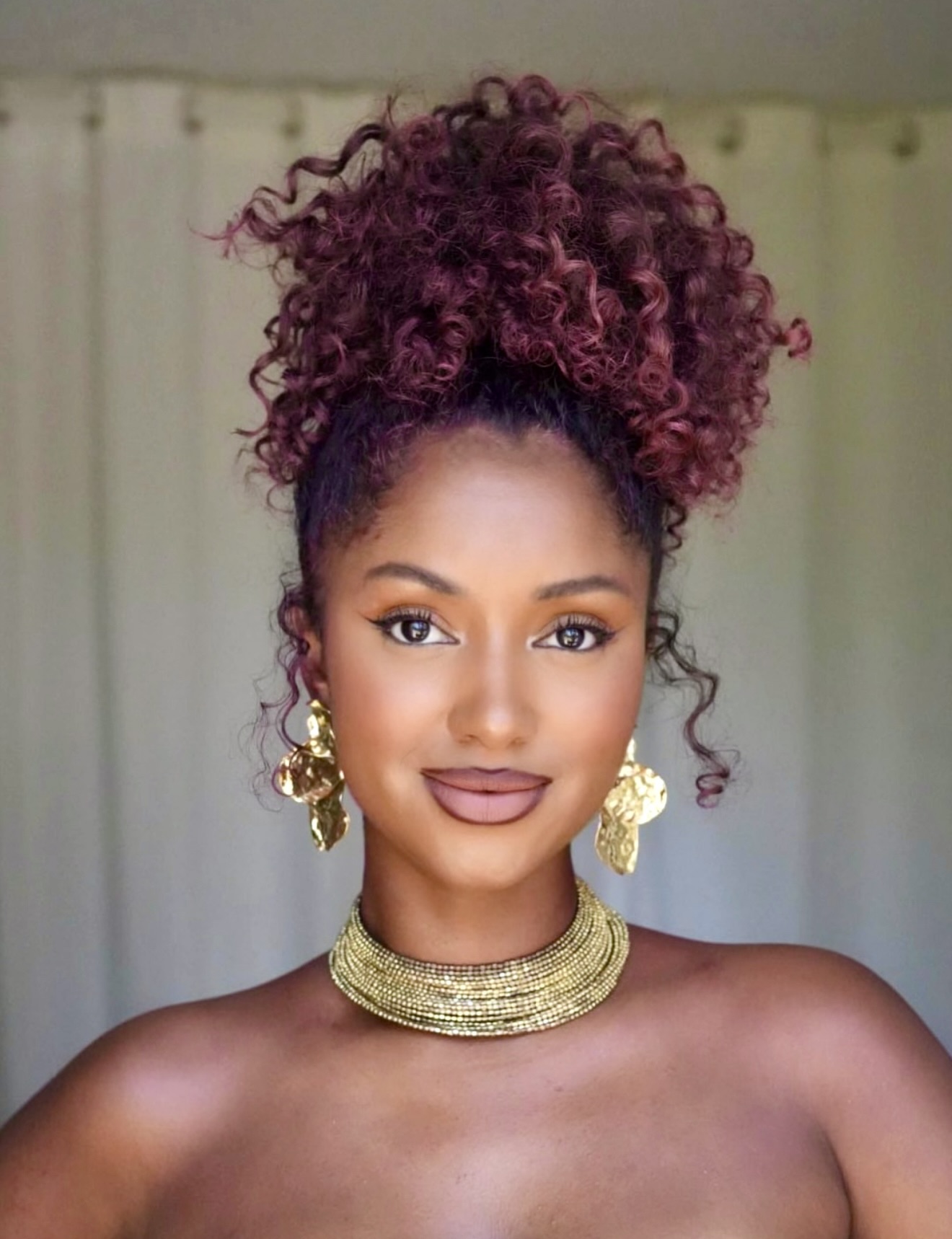 This simple bun is perfect on women with coily/natural black textures which are thick and hold their shape. It looks great on a formal or a wedding and really shows off your beautiful natural curl pattern and does not require heat! Add a little curl cream or leave in conditioner to break up strands and pin with a few pins. Slick it back and half-bun does not mean a slick straight back. No on this, intentionally leave those curls.