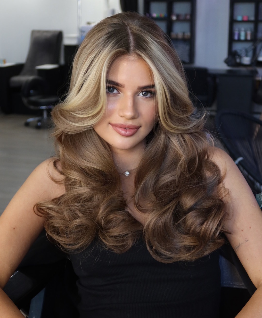 Golden blonde waves have a way of lighting up your entire appearance, almost like carrying a ray of sunshine into the colder season. The combination of lighter ribbons and darker roots is soft, organic, lived-in, and just the right amount of chic.