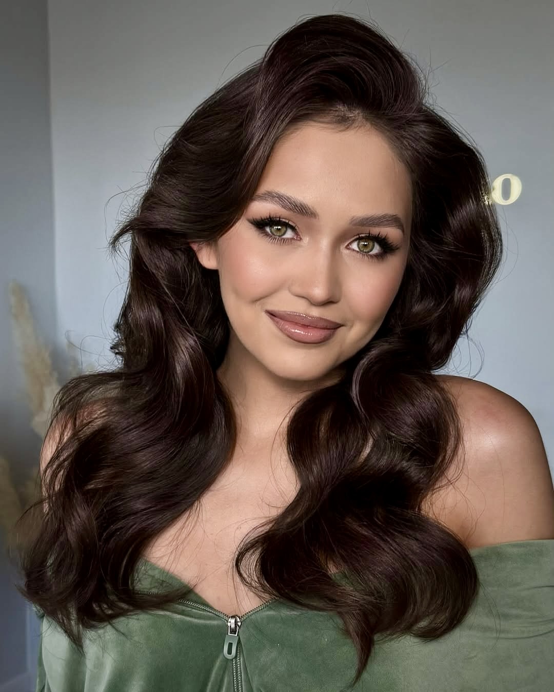 These chocolate brown hair waves sing out in luxury, while the softness is completely irresistible. The volume at the crown creates a lively and confident look, similar to what you’d see in a perfume ad and it fits any situation from a small birthday gathering to a boistrous cocktail soirée.