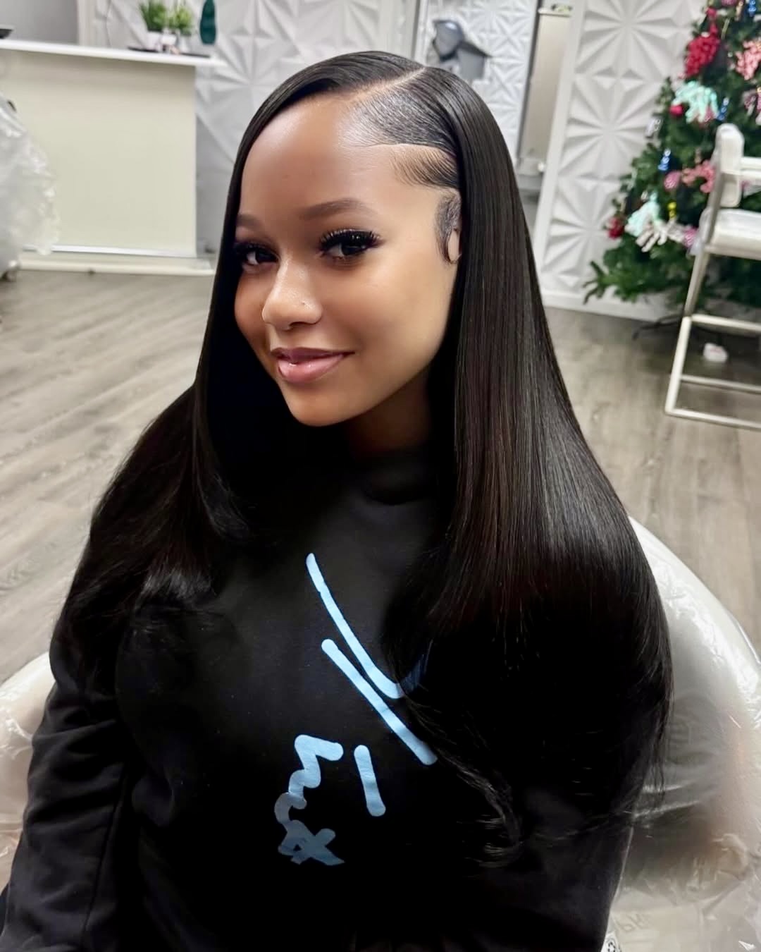 We are talking about power hair here well, quite literally, really, this slick, sleek, quick weave has business in mind. With the side part straight hair being so sharp cut to look at it, as well as being so long, it is bound to turn heads. It states “I am here and I am shiny and I am not sorry to occupy space.”
