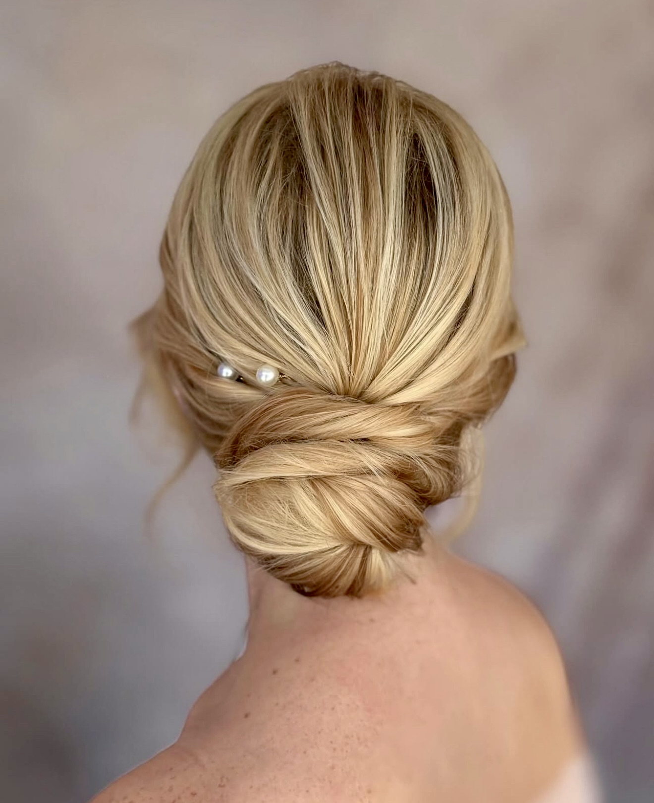 This is a low bun wedding style with pearls which is just all romance. The gentle twist and nape of the neck and the fine jewelries of pearl make it appear it should be in a bridal editorial even. It’s gentle, graceful, and impossibly elegant.