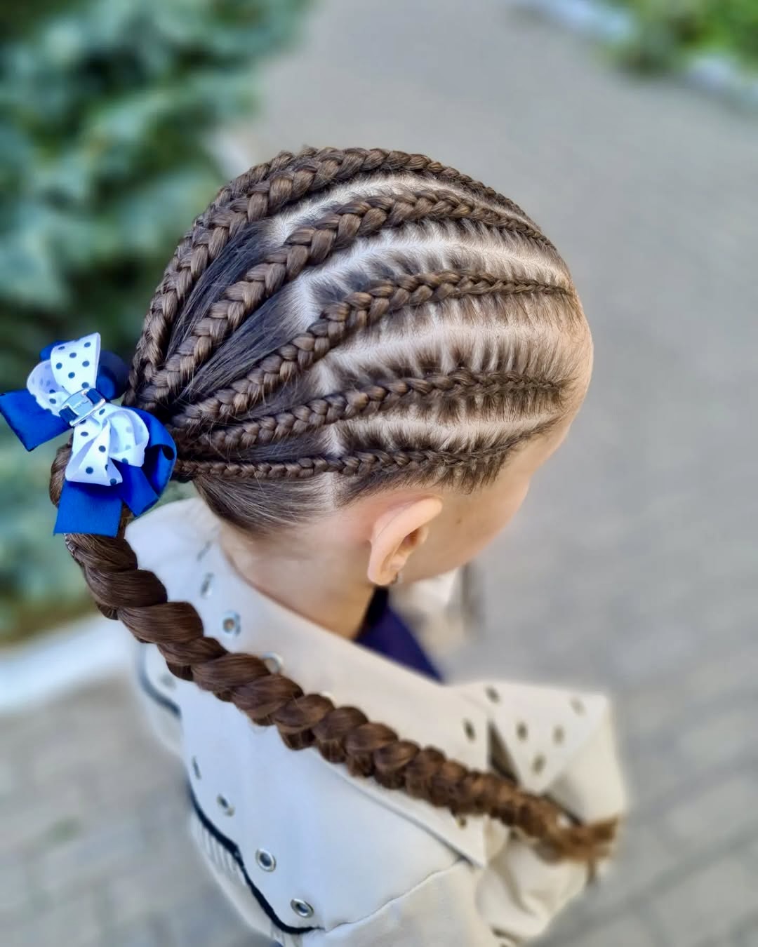 This unique combination of braids and bubble sections is a charming twist on traditional school styles. The gold accents and intricate sections of the bubble braid provide both fancifulness and a clean arrangement of the mini braids. The checkered ribbon makes the hairstyle aesthetically pleasing and suitable for medium to long hair types. The sophisticated look of this hairstyle requires little practice, so kids can easily maintain their look throughout the day. For moms looking for school hairstyle ideas that are both stylish and safe, this is a winner.