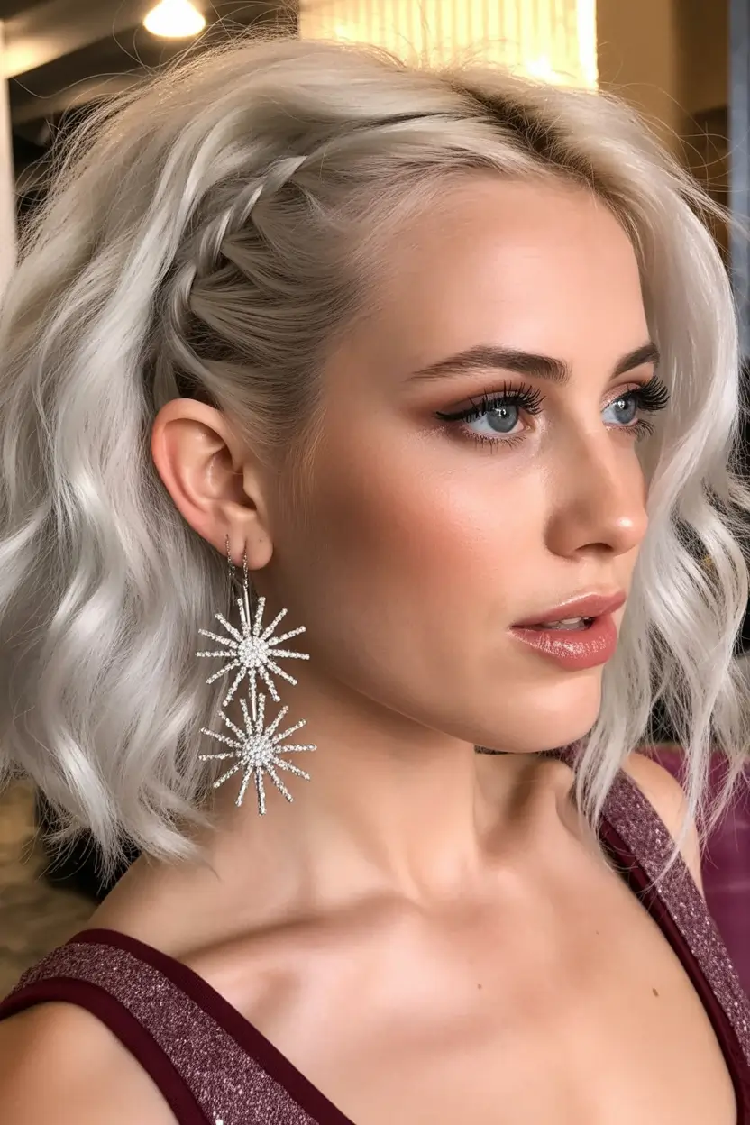 This wavy blonde hairstyle is perfect with the icy platinum blonde hair color to accentuate all the icy coolness, yet there is a slight side braid that forms an additional dimension but does not overpower the whole picture. And the most beautiful thing about it is that it would work so well as a wedding guest option, particularly with big bold earrings and a deep jewel-colored dress.